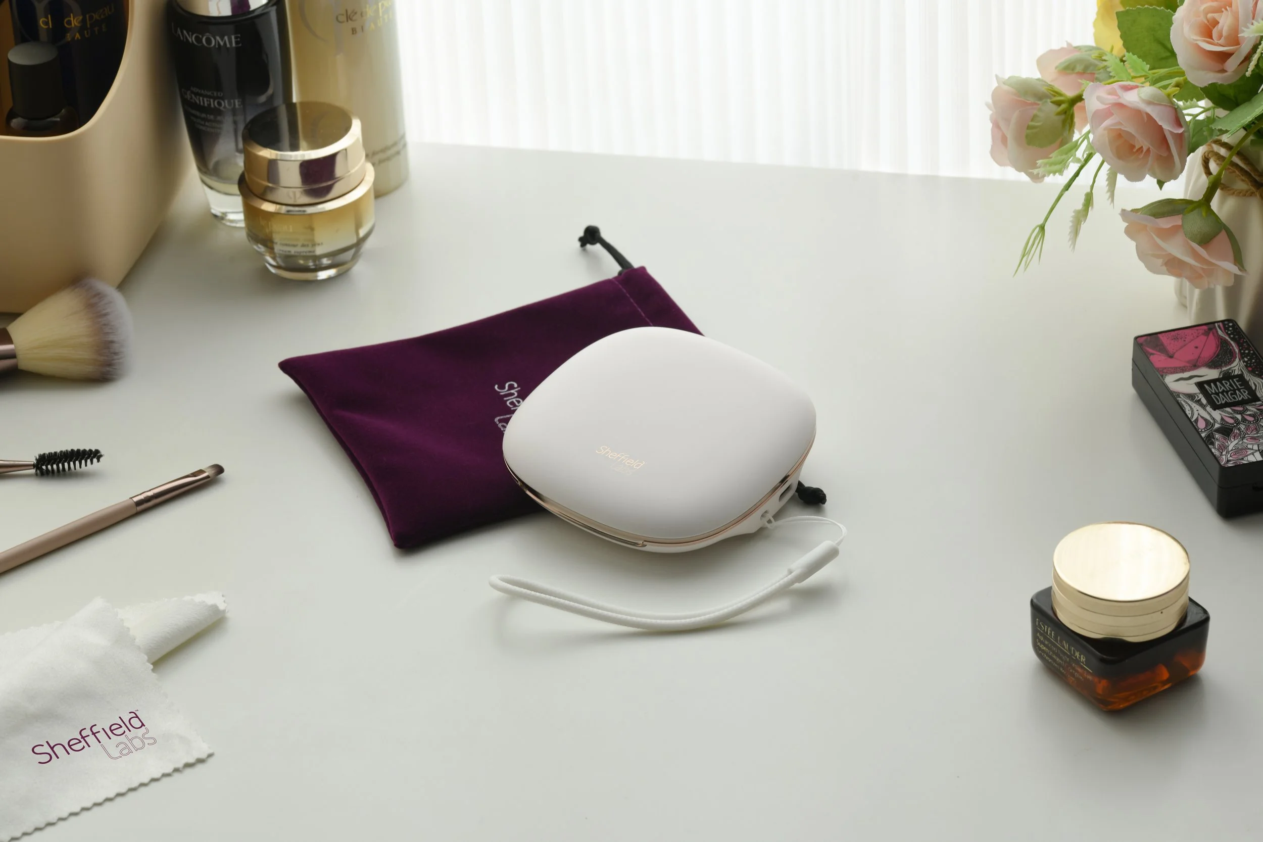 Discover effortless radiance with MICHELLE, designed to enhance your beauty in any light. This sleek, compact mirror delivers a precise, clear view with three LED light settings, full-range dimming, and a 10x magnifying lens to capture every detail. Compact enough to slip into an evening bag or clutch, it offers up to 9 hours of continuous illumination on a single charge, ensuring flawless makeup or skincare touch-ups on a night out, during travel, or wherever life takes you. Complete with a luxurious velvet travel pouch for protection, a scratch-free cleaning cloth tailored for its mirrored surfaces, and a removable wrist strap for added convenience, MICHELLE is your perfect companion for pristine elegance on the go.